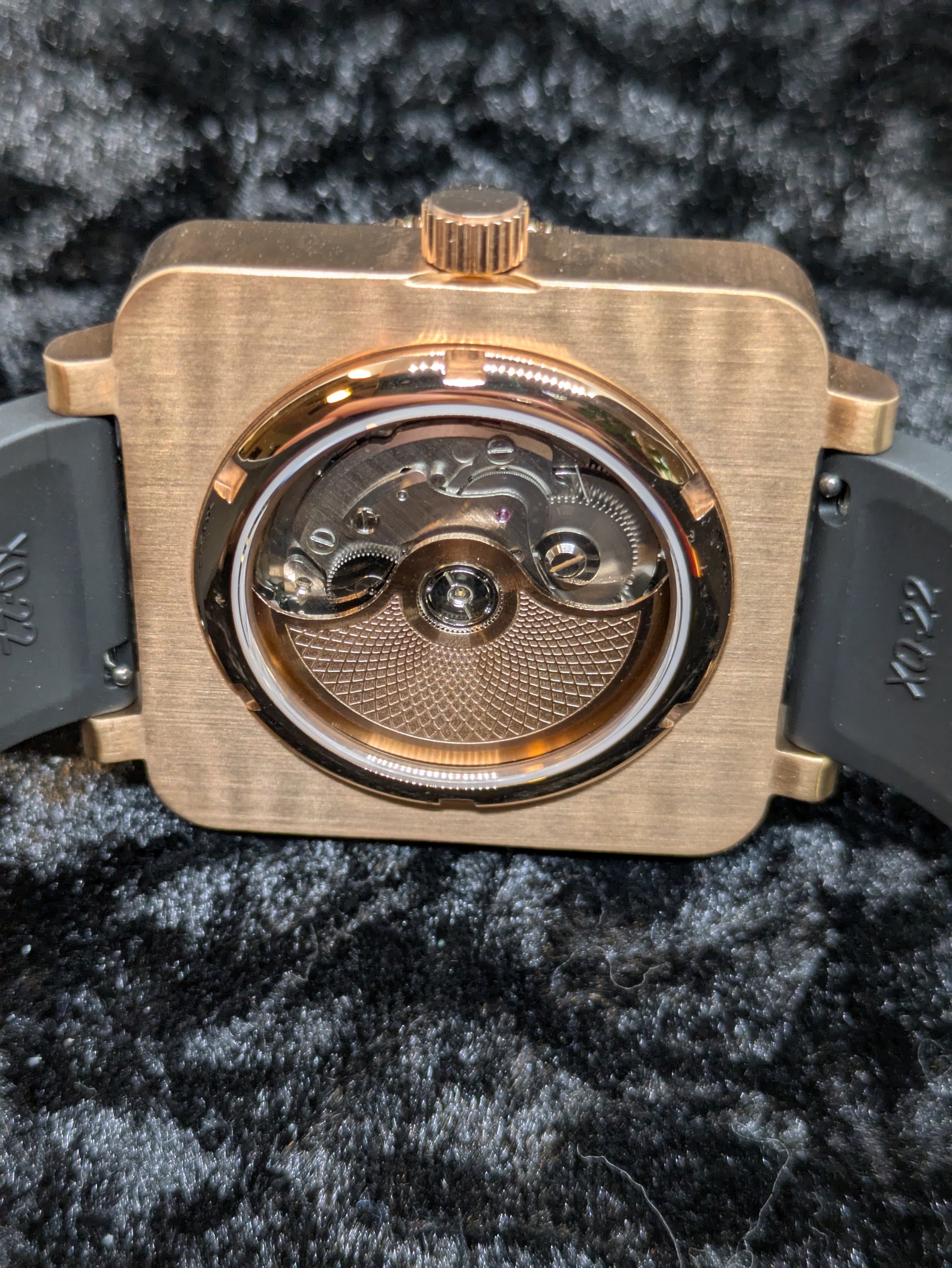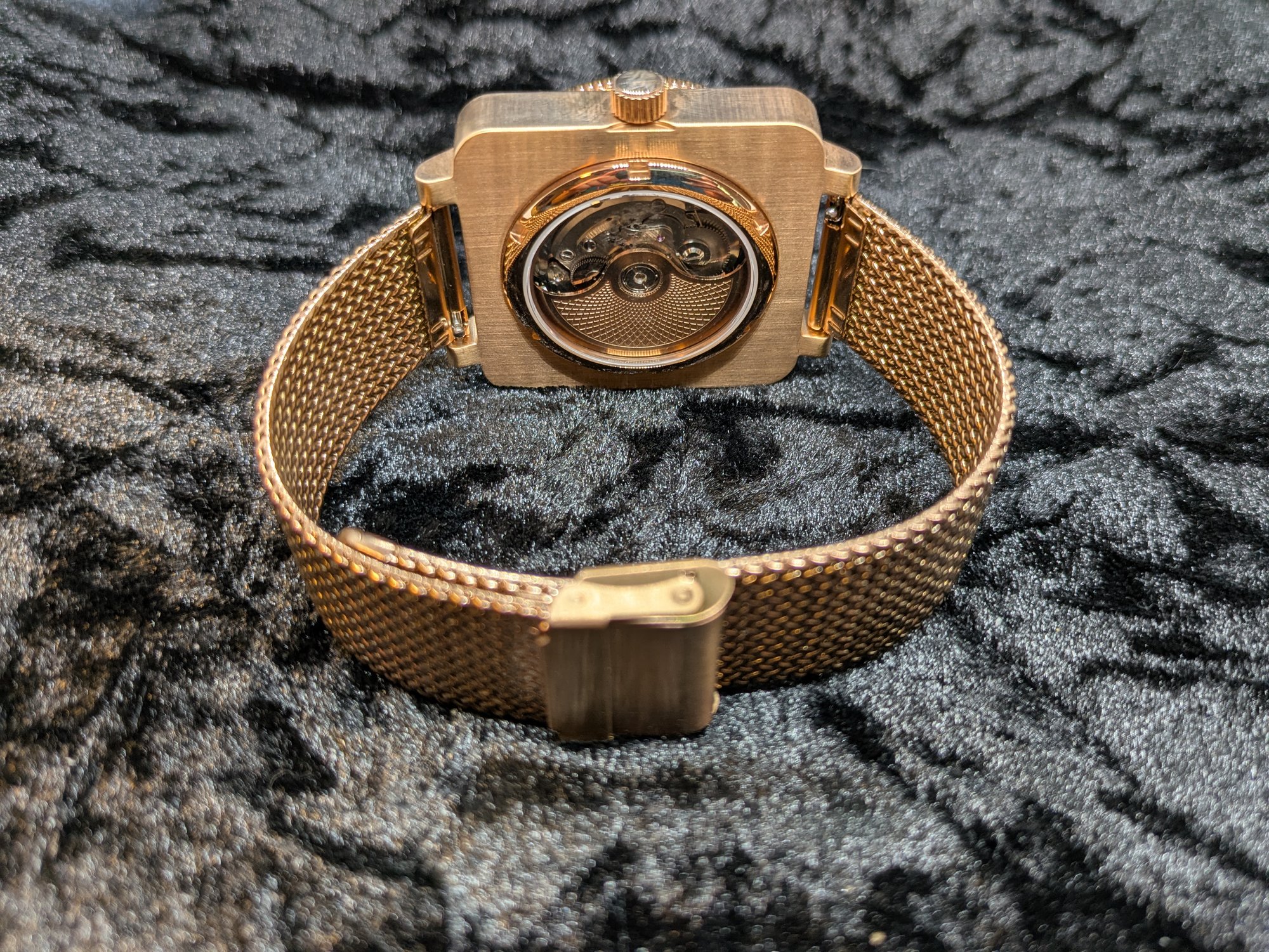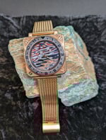 The aircraft instrument style case uses a sapphire crystal and is finished in rose gold with black tropical deployment strap. The case houses a reliable Seiko NH38 (time only) automatic movement with a 40 hour power reserve. The caliber is fitted with rose gold Mercedes style hands and a matching rotor.