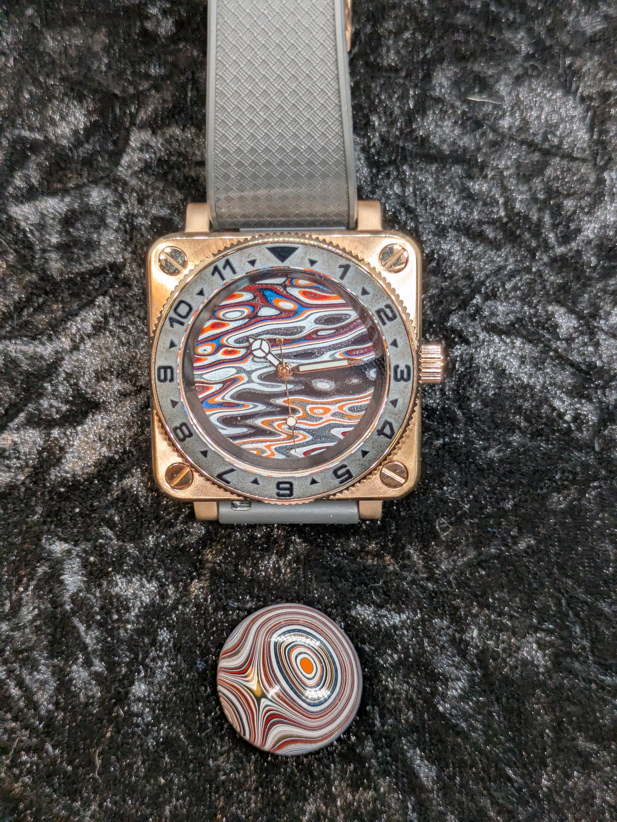 This unique and sporty watch features a handmade Fordite dial, the rare industrial gemstone created from decades of paint from the floors of the Ford factory paint shop that became mineralized. It shows decades of the brand's paint colors going back to into the classic years.