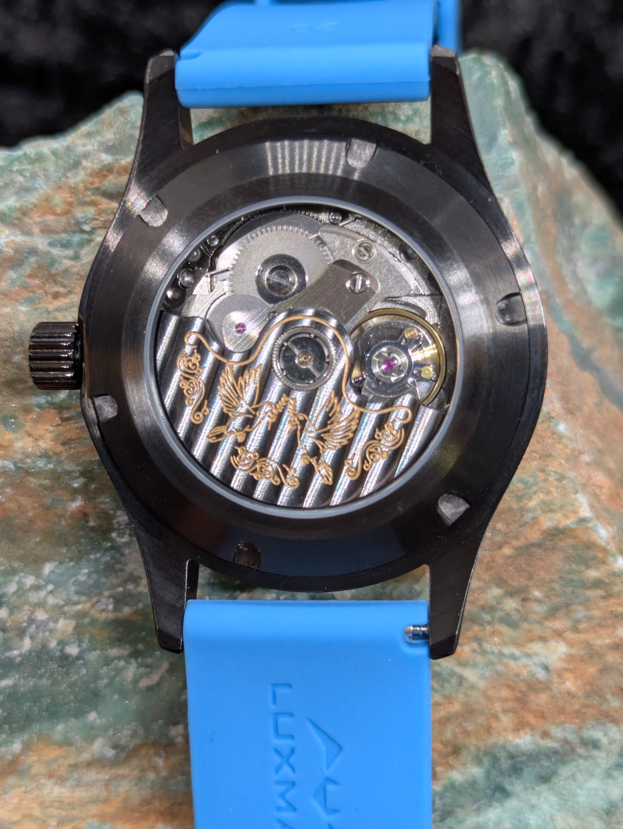 Celeste in blue features a geometric pattern dial which shows a constantly changing, kaleidoscopic view of time and is sure to turn heads. Hours and minutes can be read from the lumed triangles on the large and medium size dials. The 39mm black PVD case features a blue tinted anti-reflective sapphire glass which adds to the mystique of this model. Celeste comes fitted with a glow in the dark blue strap with matching black PVD buckle. The watch features a reliable seiko NH38 (time only) 23 jewel automatic movement with a custom black and gold rotor. The watches come with a black velvet pouch. Hand assembled in Austin.