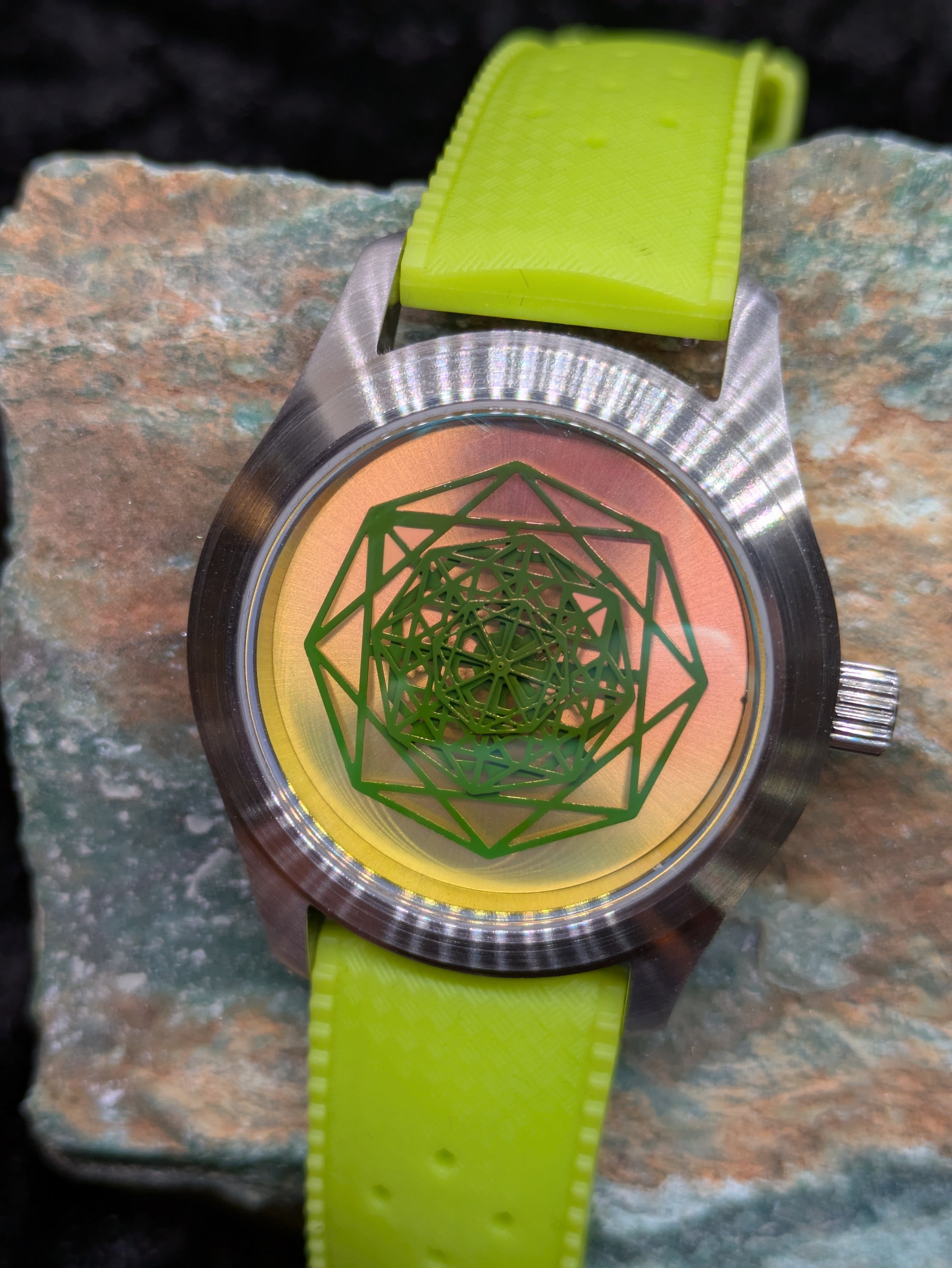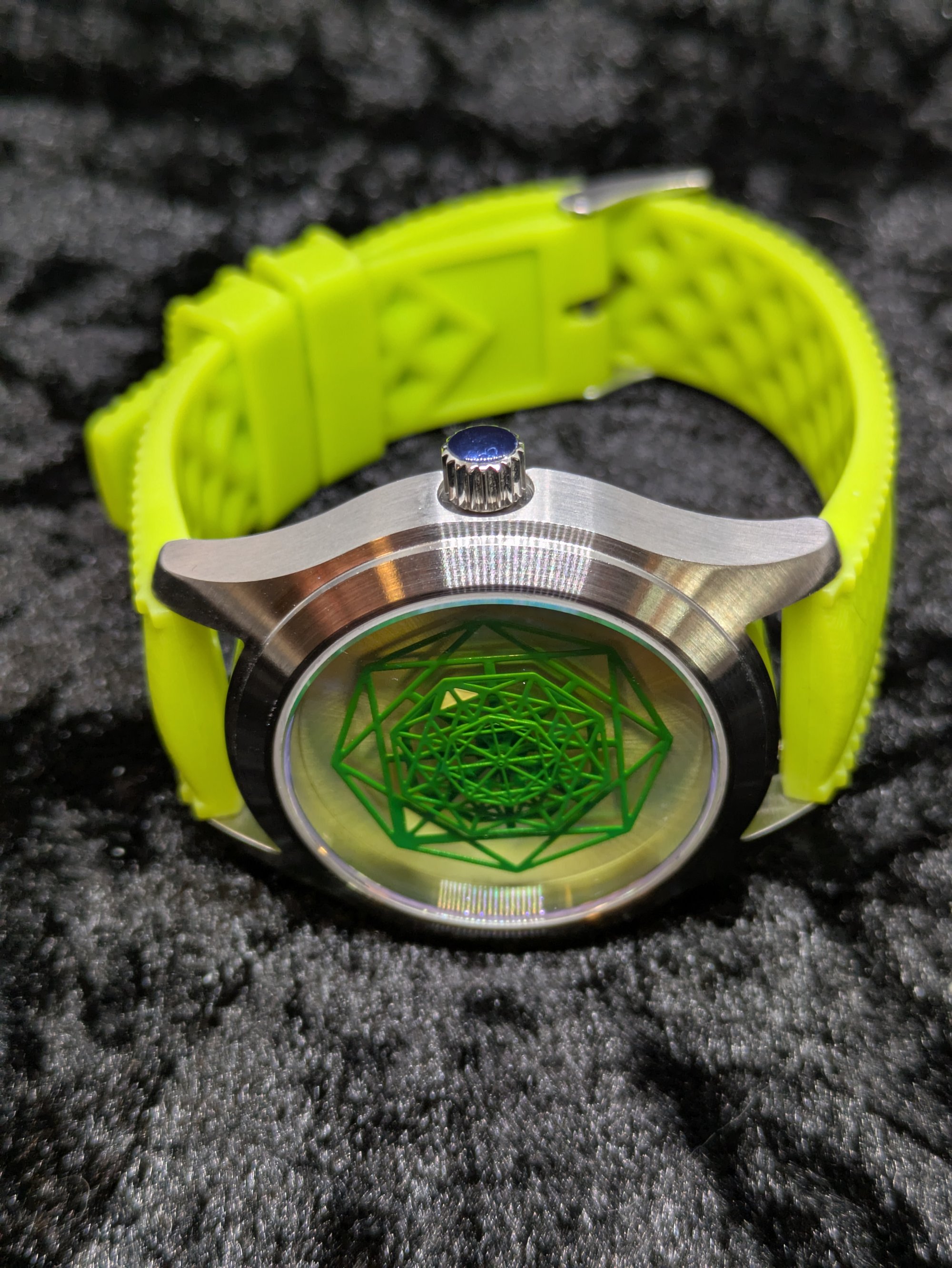Emerald City features a geometric pattern dial which shows a constantly changing, kaleidoscopic view of time and is sure to turn heads. Emerald City is an homage to the Wizard of Oz story and the Wizards Wrist brand. Hours and minutes can be read from the lumed triangles on the large and medium size dials. The 39mm black PVD case features a blue tinted anti-reflective sapphire glass which adds to the mystique of this model. Celeste comes fitted with a glow in the dark blue strap with matching black PVD buckle. The watch features a reliable seiko NH38 (time only) 23 jewel automatic movement with a custom black and gold rotor. The watches come with a black velvet pouch. Hand assembled in Austin.